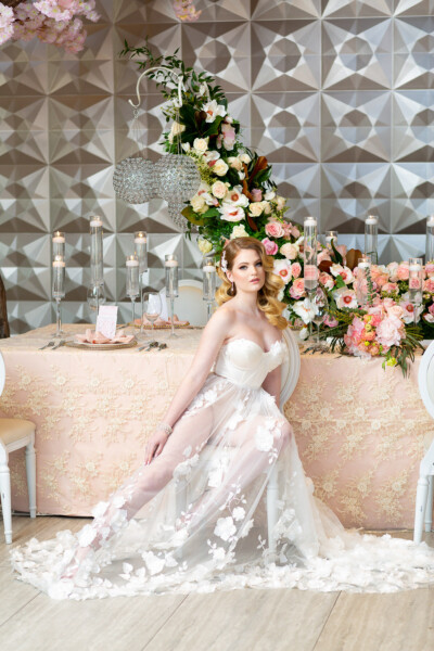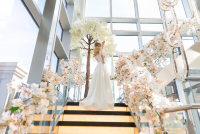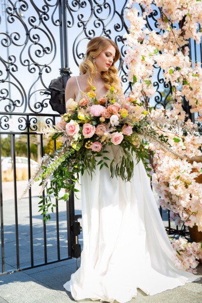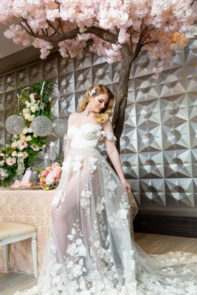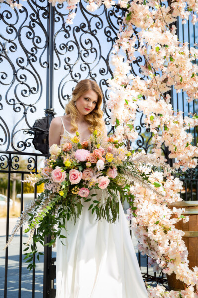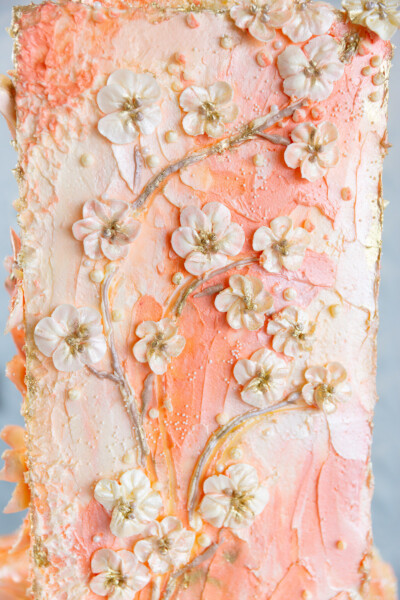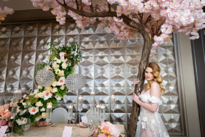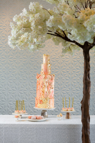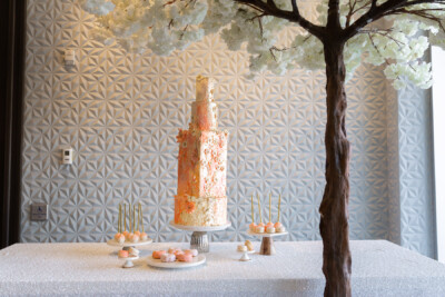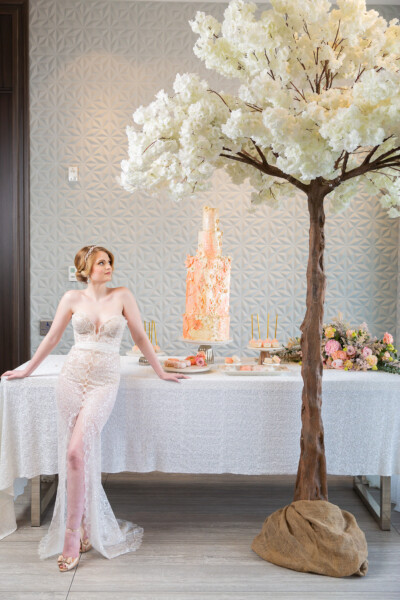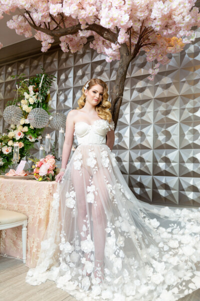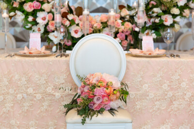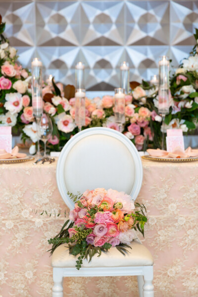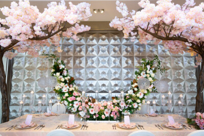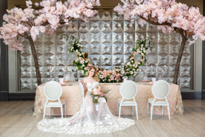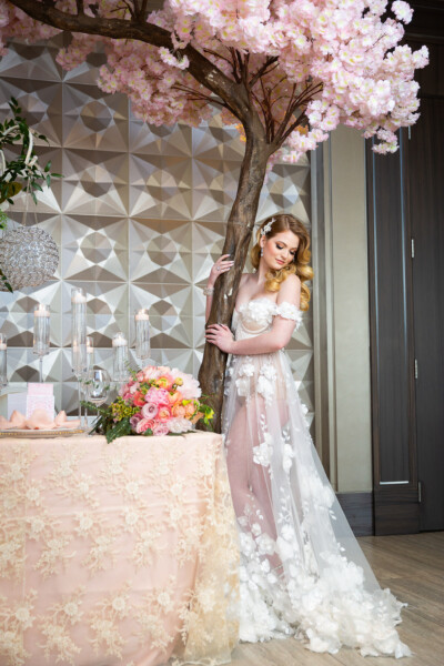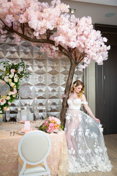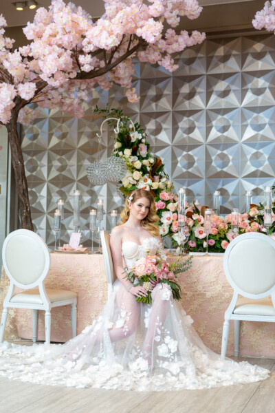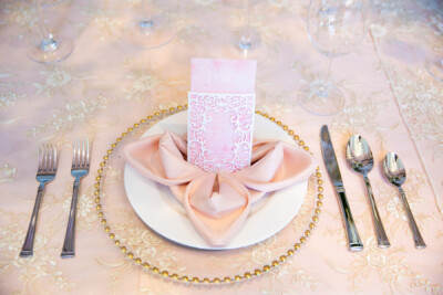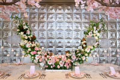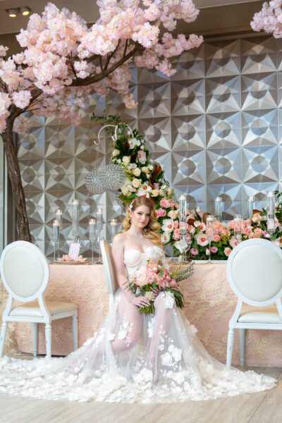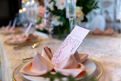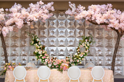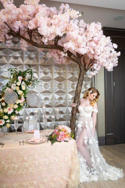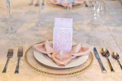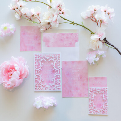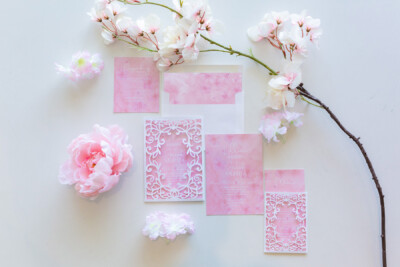 Stationery with white filigree laser-cut sleeves, lots of pretty pink and coral colors, and cherry blossoms everywhere made this a beautiful shoot.